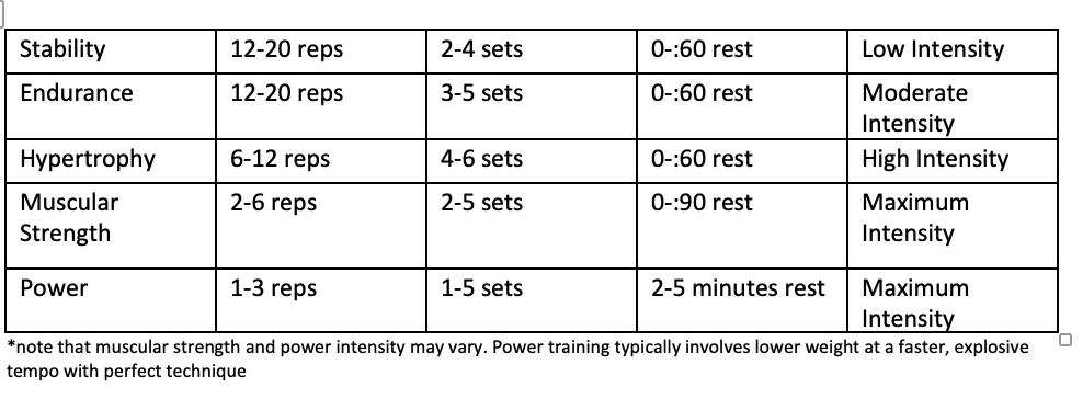 - Maximal Strength: This is an advanced stage of training. Reps are LOW, intensity is HIGH, and rest is long. In order to be successful in this stage, you’ll need an excellent foundation of form, technique, stability, mobility, endurance, and strength or you will most likely suffer an injury. Try not to stay in this stage for an extended amount of time: decompression/ rest weeks are key in preventing injuries and overtraining.