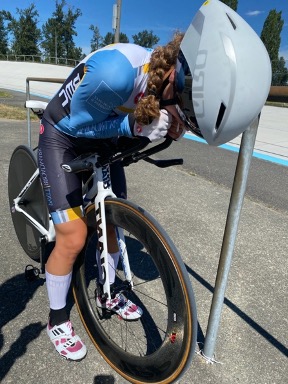 Fast forward 48 hours. I nervously gulped an orange, caffeinated gel and tightened my cycling cleats for the 5th time. It was time. Time to take on the most painful, lonely event that exists: The Hour. The Hour is 60 minutes on a sloped track, on a fixed gear track bike, with no metrics, fuel, or hydration. Once the gun goes off, you are alone until you quit or reach 60 minutes. The pain is immediate. Fixed gear bikes are unique in that there is no rest within the pedal stroke, no ability to change gears, coast, or rest even for a fraction of a second. You are restricted to one position (referred to as aero or time trial position) hunched over your machine, praying for the end to come as soon as you start. An ominous black line guides you around the curved velodrome until your vision becomes blurry from a sustained maximal effort. I’ve done it once before, exactly one year ago when I set the elite women’s record at my local velodrome, and with Covid-19 decimating all other race venues this was the only opportunity to compete in 2020. I wasn’t prepared in the slightest. I had barely ridden my fixed gear bike and knew my muscles were going to ache sooner. I had forgotten all I’d learned in the previous year about gearing and cadence required to be successful on the track. So why did I agree to try and break my own record when it had every chance of standing another year?