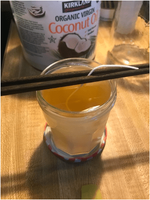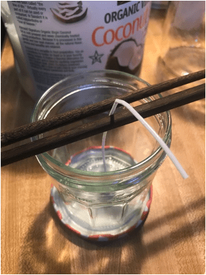 Directions: Place coconut oil and beeswax in a large microwave safe bowl. Heat for 1 minute at a time, stirring after each minute until completely melted and blended. Stir in essential oil. Place wick in empty, securing in place with two chopsticks so it stays in the middle. Pour liquid slowly into jar, adjusting wick if needed. Allow to cool, trim the wick, and enjoy!