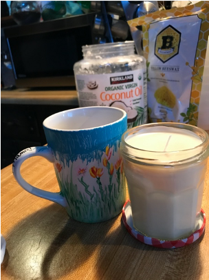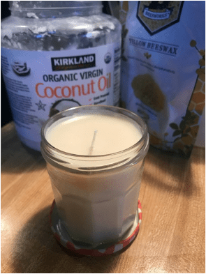 Supply List: ½ cup coconut oil, ½ cup all-natural beeswax ($14 on Amazon or Hobby Lobby), 10 drops essential oil of your choice, #4 wicks (less than $5 on Amazon or Hobby Lobby), glass container (repurposing an old jelly jar is my favorite!)