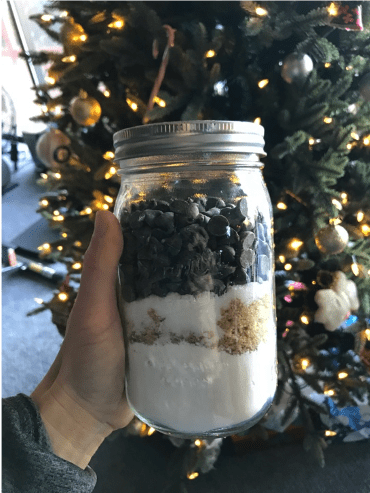 Supply List: 1 ¼ cup flour, ½ cup brown sugar, ½ cup granulated sugar, ½ tsp baking soda, dash of salt, 1 cup chocolate chips, large Ball Jar, notecard for instructions.