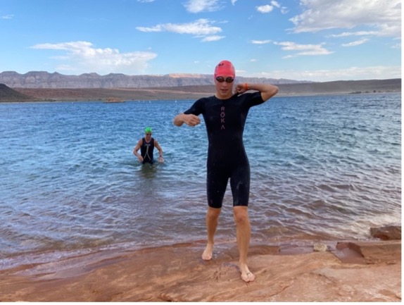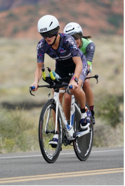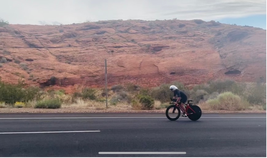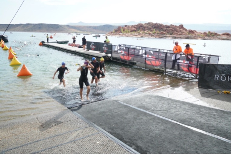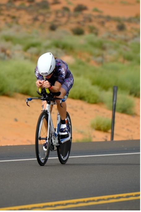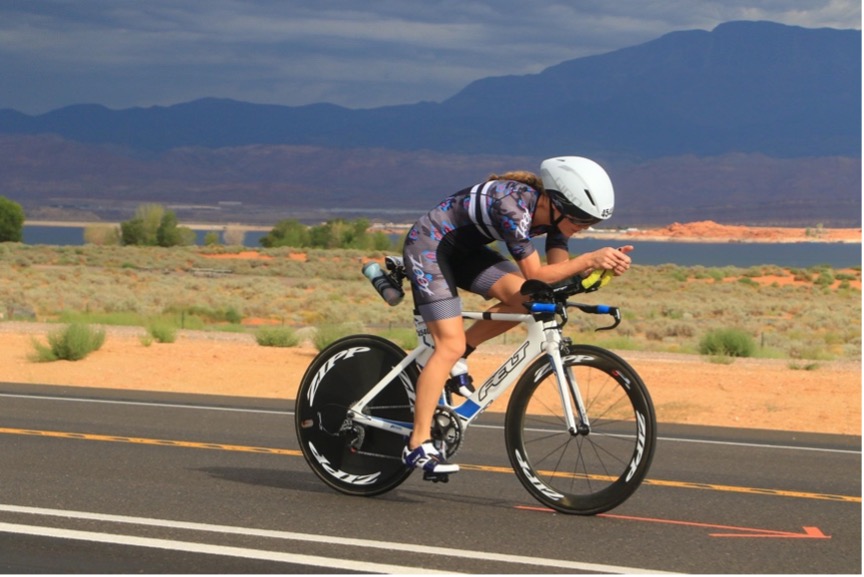 Sand Hollow is an absolutely gorgeous place to swim, and I tried to acknowledge the scenery of each venue I race even if I’m dying a bit from the effort! The blue water against the surrounding red rocks is breathtaking. I smiled as the shoreline approached, glanced at my time and headed into transition towards my bike. I was hoping for a 33-35 minute swim, and finished in 34 minutes and change, a 7+ minute PR from my last and only non-wetsuit half ironman swim.