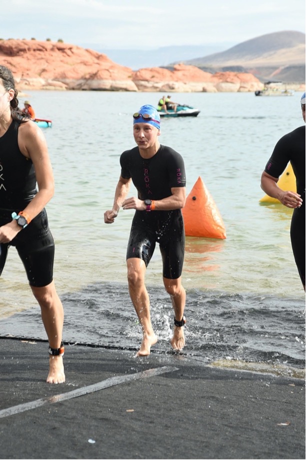 I got dropped by the first group I started with and the next group that came through, which is common. I always start near the front and hold on as long as I can. I struggle with congestion, and typically lose feet easily if I get jostled around. Something to work on for sure! I stayed calm and held my tempo effort, reminding myself today was going to be a long day and if I couldn’t hold a certain effort to let it go and race MY race. I hoped another strong-ish swimmer from a later wave would come through to help me! The swim is draft legal, which means you can sit behind another swimmer and save a significant amount of energy. Thankfully, a girl came by and I knew I couldn’t let her go. We swam the entire second half together, weaving through women from age groups released up to 4 waves in front of us.