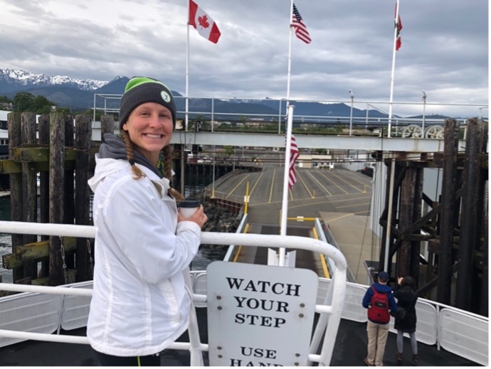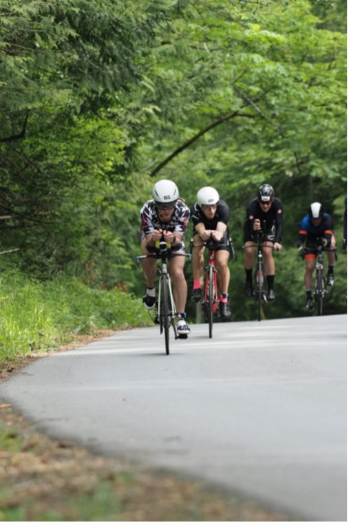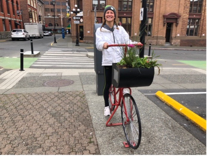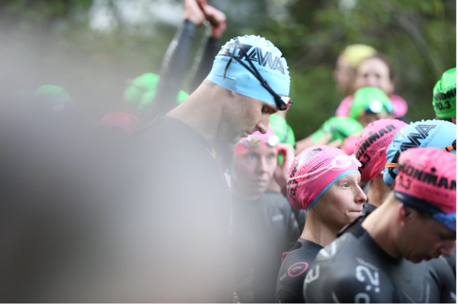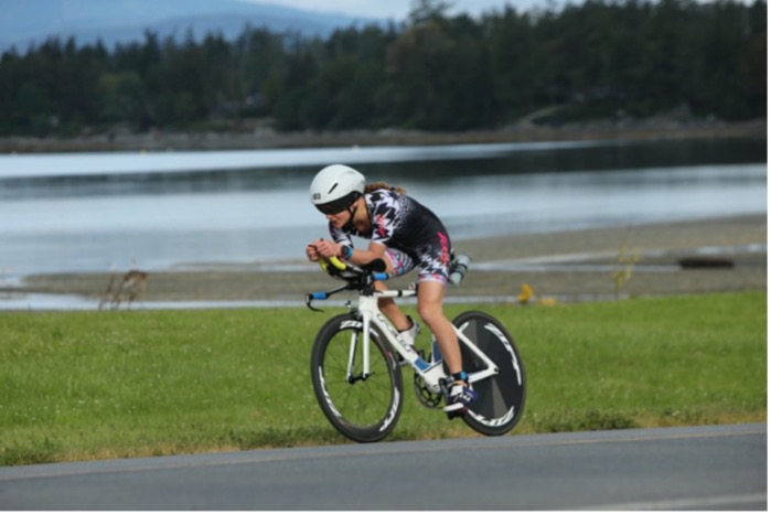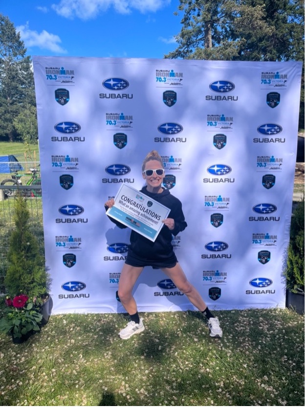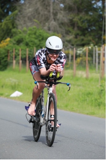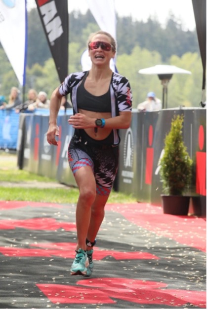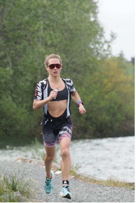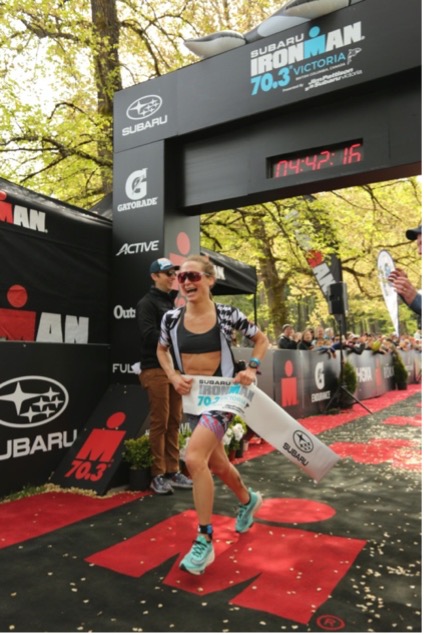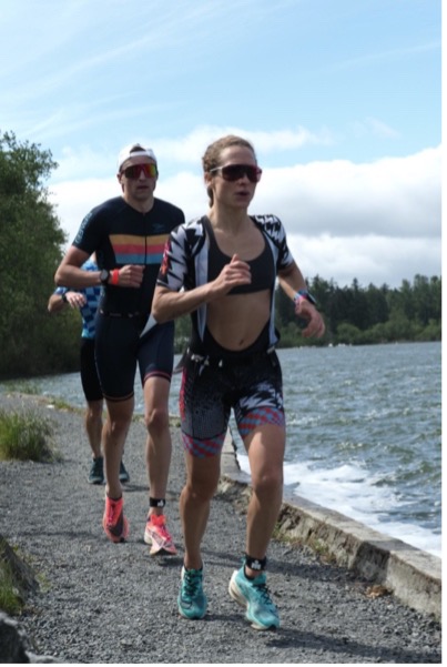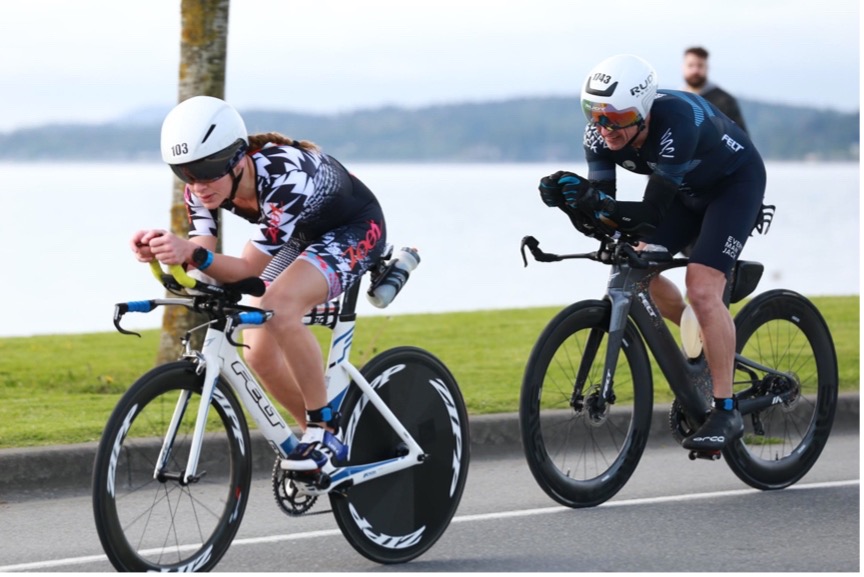 The first 10km of the bike was pretty cold. At 6:30 am, soaking wet from a cold swim and right onto a bike pushing 20-30 miles per hour with air temps in the 50’s isn’t what I would choose to do on a typical Sunday morning, but I managed to get past the crowds early on and found a good rhythm. Another female rider was riding super well, and we stayed together well for several miles and even exchanged polite words here and there. I recognized her kit, and knew she would push me, so kept her within sights as much as possible on the technical, one-loop, hilly bike course Victoria offers. I was pleased to see Elliot on the final hill, about where I was hoping to see him. Unfortunately, he crashed just over halfway on the bike and knocked his headset loose, so aero position wasn’t as stable for him and he lost a lot of time. Thankfully he only suffered road rash on his arms and knee, and a minor bruise on his ankle.