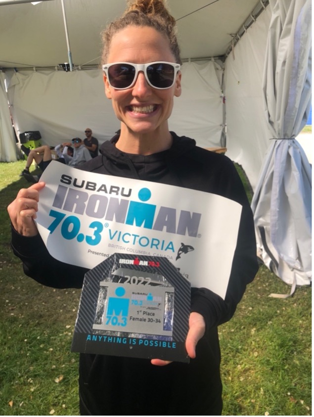 I felt emotional coming to the finish line. I had crossed the line first in races past, but breaking the tape with rolling starts doesn’t always mean you secure the win. Sometimes, athletes that start the swim behind you clock faster times overall, so you really don’t know you’ve won until several minutes after you finish. After an emotional collapse at the line after breaking the tape, I remember laying my head on the red carpet and telling myself : “You’ve done your job.” Regardless of what results showed, I made it to the start. I overcame the pre-race anxiety. I survived the cold swim with minimal damage. I pushed the bike and had no mechanicals or crashes. I got to the run. I found the finish line. The swim and run were not pretty, probably not what a 100% healthy and fully trained Becca is capable of, but they were enough to beat the female field by 4+ minutes overall. My run split was 2nd best of the day with a 1:28 half marathon (only 30” off being the best run of day from a gal I’ve raced before, who came in 2nd overall and suffered a mechanical! Bummer, I know it would have been a much closer race!) It’s always the goal to place as high as possible, but today I was truly just happy to finish. I am quite pleased I placed well even with the men factored in, too. (only 40 age group men managed to beat me, but soon I hope to conquer even more of them!)