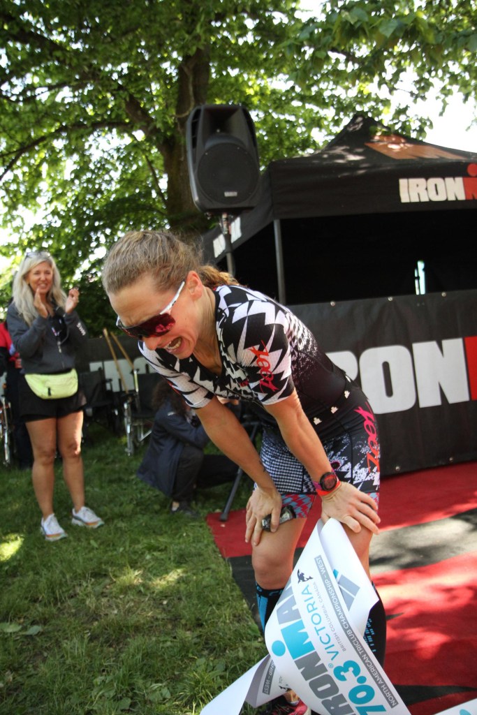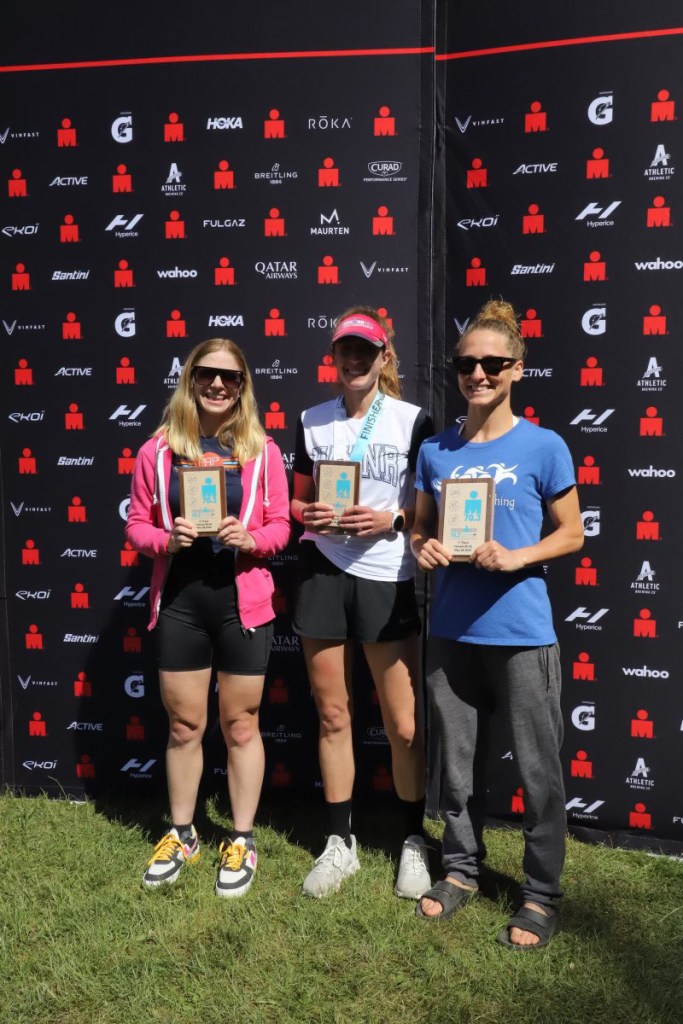 Annabel, the strong cyclist originally leading the race that I was chasing, finished 2 minutes 20 seconds behind me. However, she was disqualified from the race. Her partner was also racing, and had a mechanical on the bike. He DNF’d on the bike course, then jumped into the run and ran with her on course. He crossed the finish line next to her. Both actions are illegal. Once you quit a race, for whatever reason, you cannot re-enter the race or cross the finish line. Sadly, the battle is not reflected on official results, but I know how she pushed me and how much it brought out of me. I told her how much I respected her at the finish, and really good job. It is a bummer about the DQ, she certainly dictated the race! I, too, have learned the hard way that Ironman has strict rules in place. Third place went to Adele, the gal I had biked with and saw on the run course. The DQ moved her into 2nd overall, and 1st in her age group. Her time this year would have beaten the time I posted last year to win, which shows the depth and quality in this years event.
