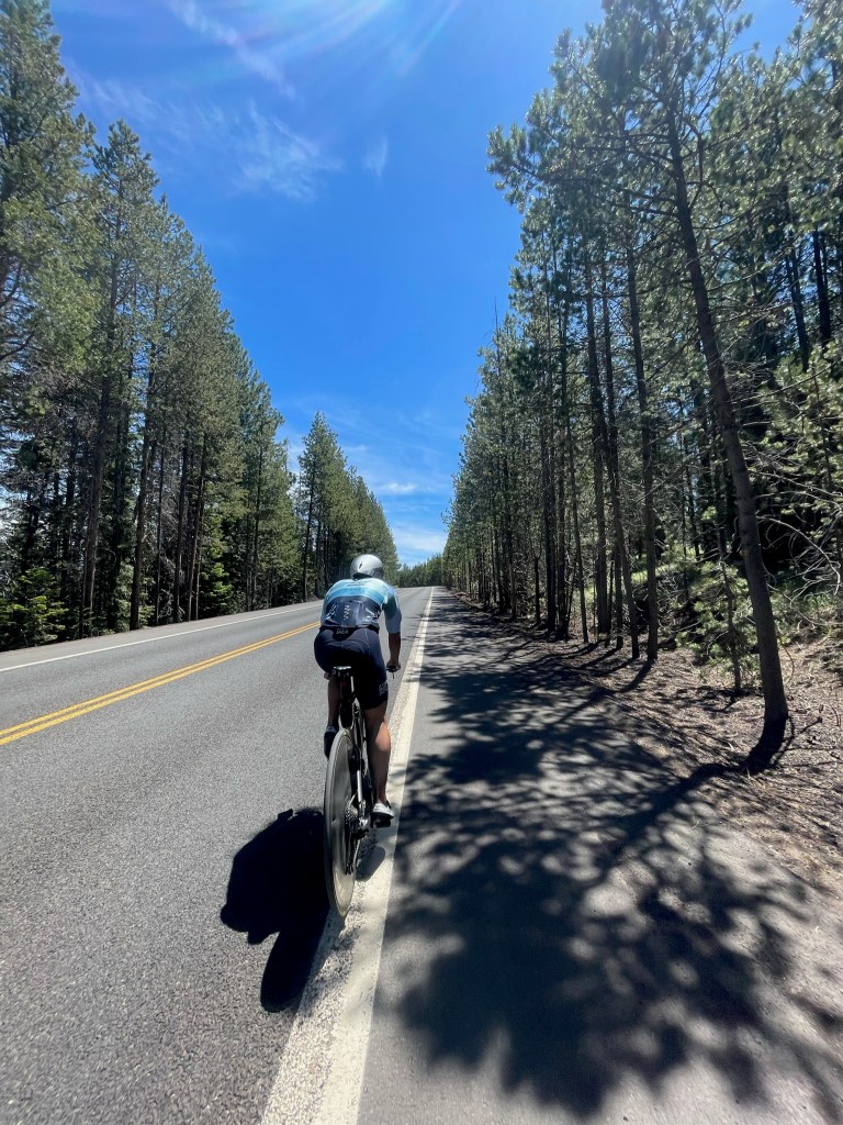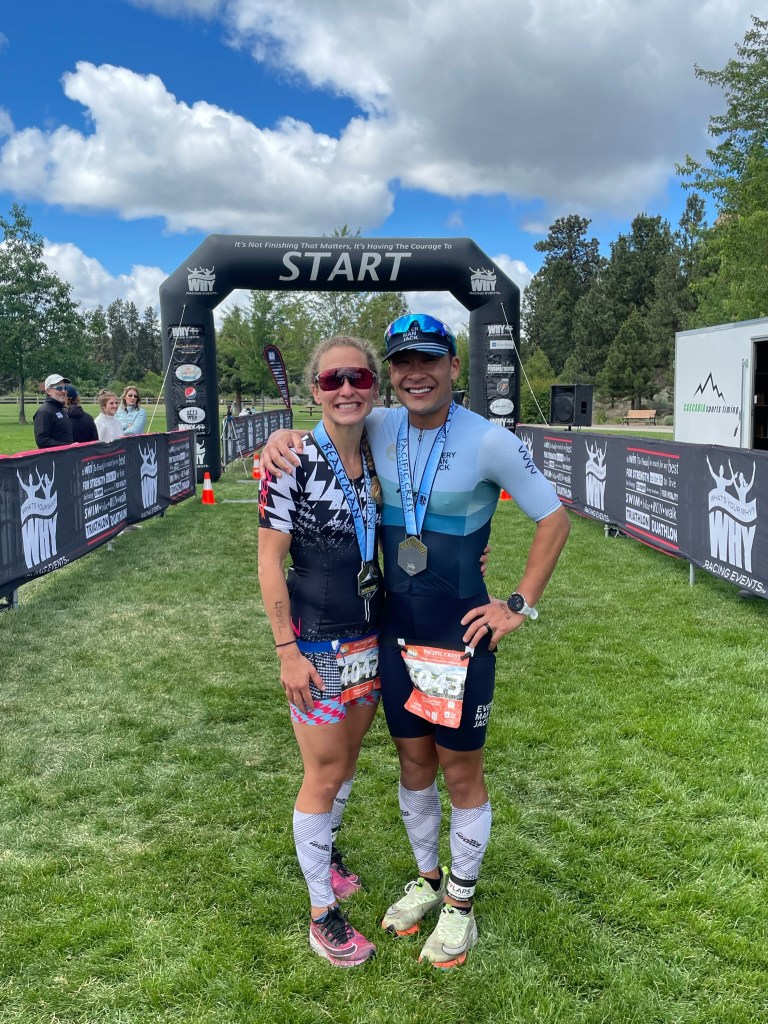 Elliot and I both heard amazing reviews about Why Racing events, the small family-owned company hosting the event, particularly about the Pacific Crest Endurance Festival in Bend, Oregon every June. After I was cleared to compete following a hip exam in April, I knew I wanted to attempt the brutal course with Elliot. It’s a cold, but short, 800m downriver swim in the Deschutes River, a fierce bike ride 56.7 miles up Mt. Bachelor with over 4500ft of climbing, and a rolling run course. Bend sits just under 4,000 ft of altitude, but athletes must climb high into the mountain before turning around for a fast descent, meaning you’re at fairly high altitude most of the bike course. It’s a new course for Elliot and I both, and suited my skill set as someone who excels at long, sustained climbs and fast descents.