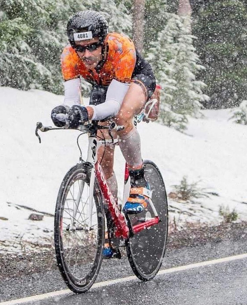 I had the best transitions of the day, and got out of T1 second overall behind leader, first year pro triathlete Devin Volk. Elliot was right behind me. I got right to work, knowing he would come by soon. The only time I was passed that day was by the second place male, pro triathlete Evan Price, at mile 6, and again by Elliot at mile 10. “GO ICEMAN!” I shouted, referencing Top Gun (one of my favorite movies that we happened to watch pre-race). From there, my only mission was to keep Elliot in sight. I let him drift away almost immediately – I have raced at altitude many times and know to check my ego when it comes to chasing. Matches burn brighter the higher you are! The first hour on the bike was a lot of climbing, so we were the warmest and the lowest altitude-wise at that time. Around mile 16, it began to rain. Around mile 22, it began to snow. Lightly at first, and then steady, heavy precipitation. I kept my eyes on Elliots blue kit and white helmet, refusing to look anywhere but forward. The hands and feet had never gained feeling out of the water, but seemed to steel to the numbness over time. I knew from racing Boston in 2018 to not get behind in calories so I clawed at my gels with my frozen hands until I got them between my teeth, the process taking up to 5 minutes sometimes.