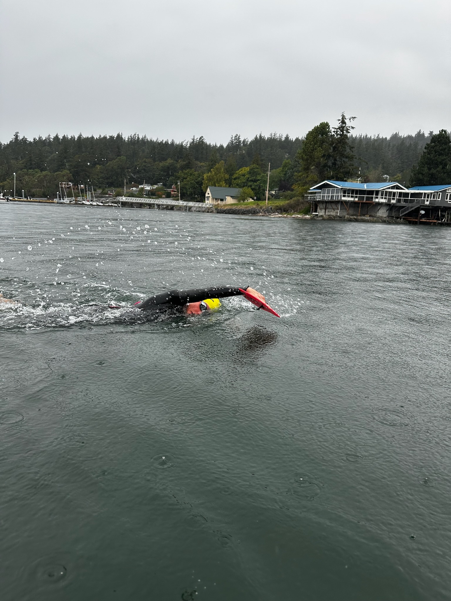As defined by the Otillo race organization: “Originating in Sweden, ÖTILLÖ translates to “island to island” in Swedish, reflecting the essence of the sport where participants traverse across a series of islands by swimming and running, often in challenging and picturesque environments.” Fun fact: there is an optional cliff jump on every swimrun course! VERY COOL! We signed up for Orcas Island: World Series distance, 21 total miles of trail running, featuring 4,000 ft of elevation gain, and 3.3 miles of open water swimming, mainly in lakes with one short, cold ocean swim early on. Air and water temps ranged from the mid 50’s to low 60’s, making it a cooler race venue.