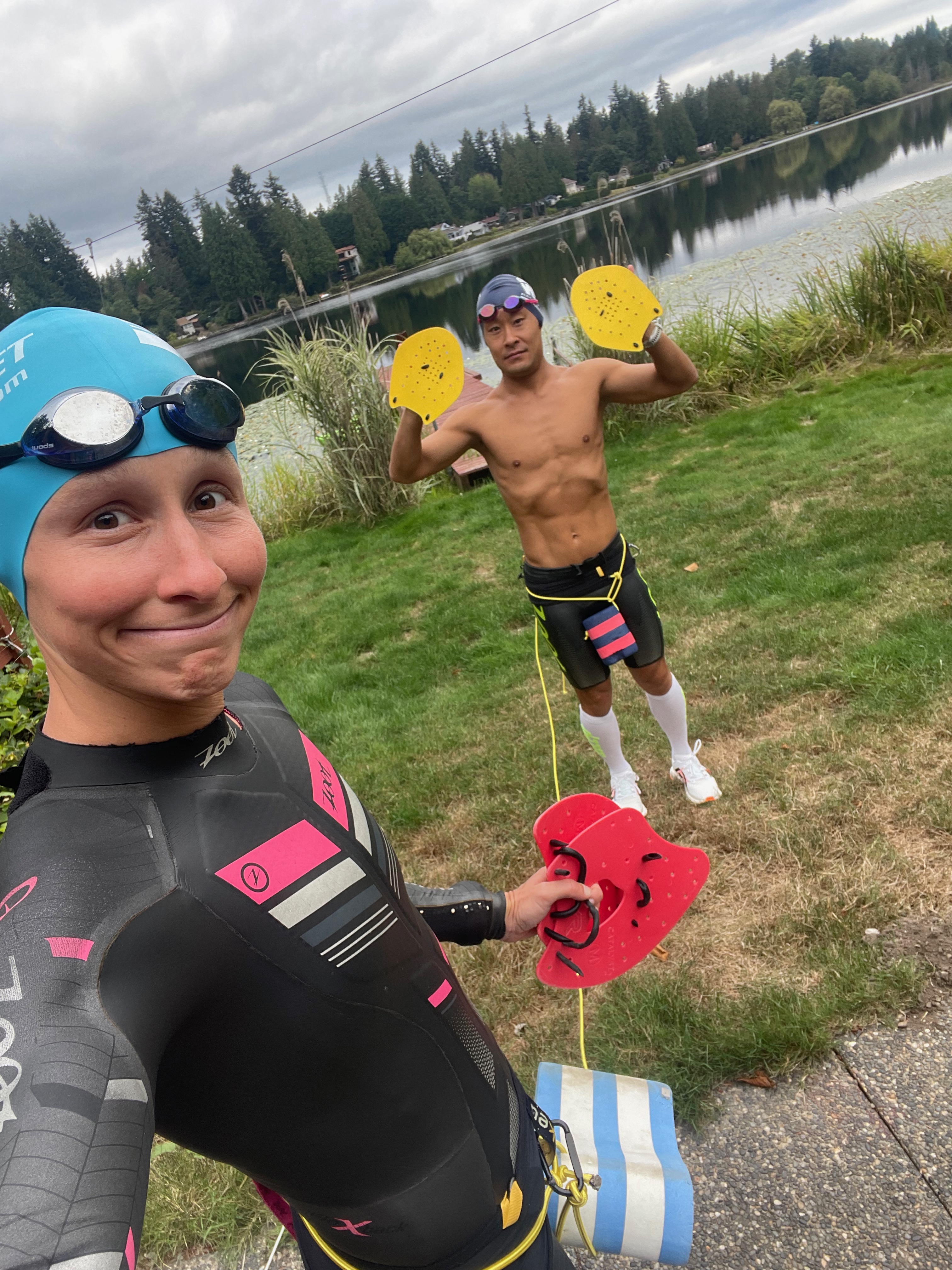 He was especially crucial in navigation: he had the distance of each leg written on his paddles so we could pace the upcoming segment and time our transitions. This was definitely helpful! I knew when to put on my cap, goggles and paddles at the end of a run leg, and counted every 100m in the water to as a sort of countdown to each swim exit (my watch buzzes every 100m). That helped when I got tired and felt like I was in the middle of nowhere! (which we were)