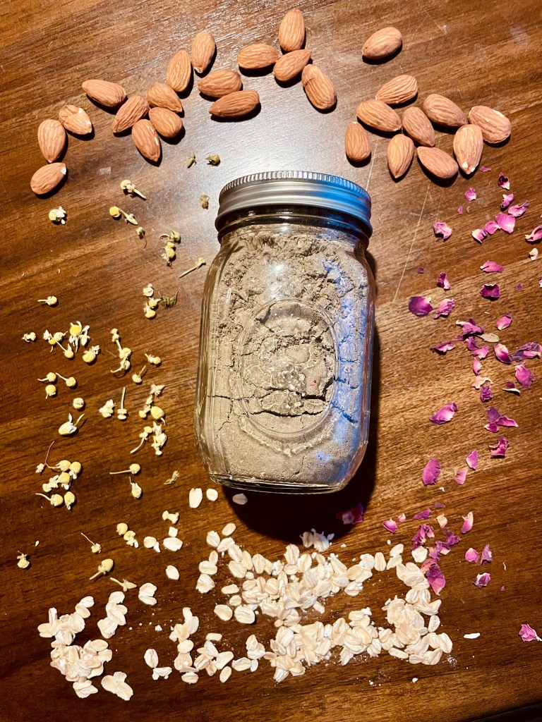 - Ingredients: Ground oatmeal, ground organic almonds, Dead Sea mud, organic rose petals, organic chamomile.