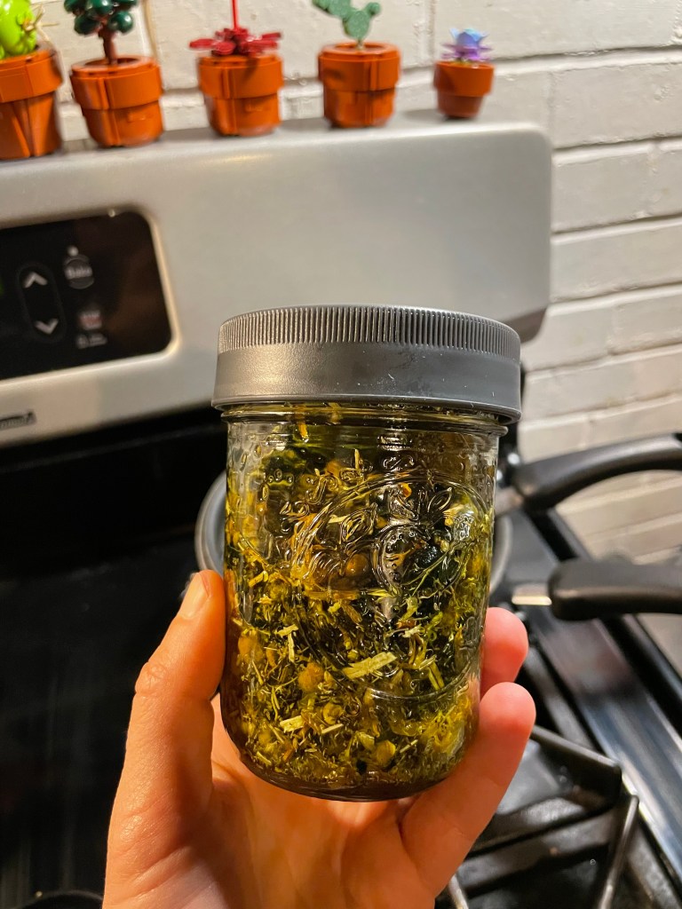- Simmer Method: Place jar in a double boiler on low heat for 4-8 hours (or over the course of a day or so). Strain well before combining with melted beeswax and essential oil to make salve.