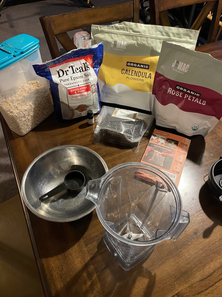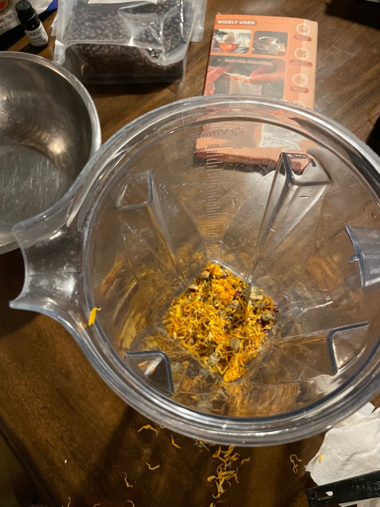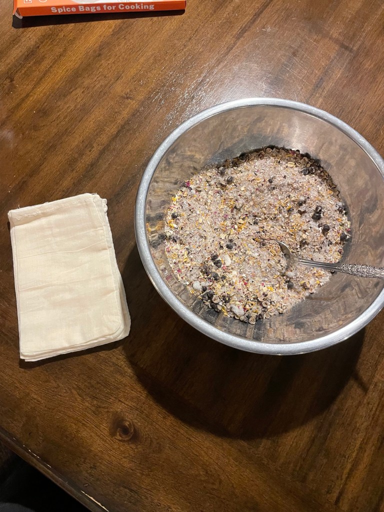 - 2-4 dried herbs of choice – I used oatmeal, calendula, rose and juniper berries
