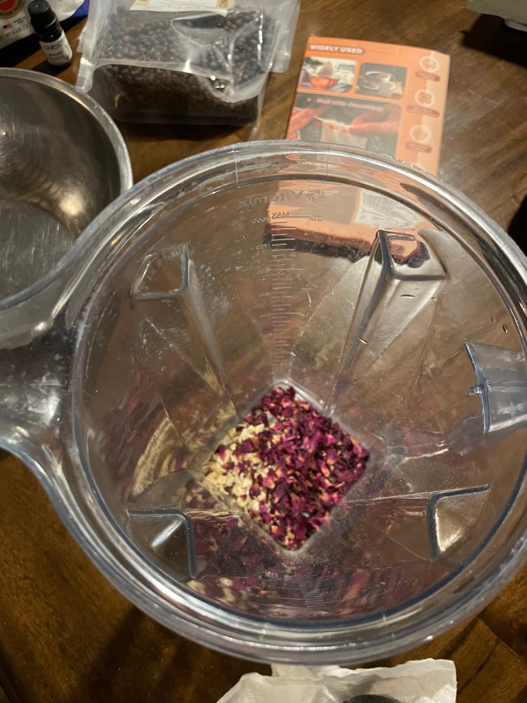 Step 4: After lightly crushing herbs in blender, add equal parts epsom salts to bowl and blend with herb mix and stir to combine. For example: I used 1 and 1/3 cups epsom salts to 1 and 1/3 cup herbs. If adding essential oils, drip 10-30 drops into bowl and toss to combine.
